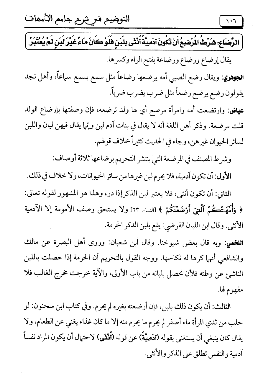 الرَّضَاع: شَرْطُ المُرْضِعُ أَنْ تَكُونَ آدَمِيَّةً أُنْثًى بِلَبَنٍ فَلَوْ كَانَ مَاءً غَيْرَ لَبَنٍ لَمْ يُعتَبَرْ