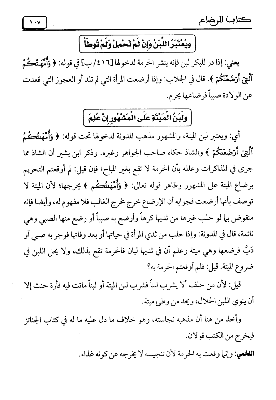 أي: ويعتبر لبن الميتة، والمشهور مذهب المدونة لدخولها تحت قوله: {وَأُمَّهَاتُكُمُ اللَّاتِي أَرْضَعْنَكُمْ} والشاذ حكاه صاحب الجواهر وغيره. وذكر ابن بشير أن الشاذ مما جرى في المذاكرات وعلله بأن الحرمة لا تقع بغير المباح، فإن قيل: لم أوقعتم التحريم برضاع الميتة على المشهور وظاهر قوله تعالى: {وَأُمَّهَاتُكُمُ ْ} يخرجها، لأن الميتة لا توصف بأنها أرضعت فجوابه أن الإرضاع خرج مخرج الغالب فلا مفهوم له، وأيضاً فإنه منقوض بما لو حلب غيرها من ثديها كرهاً وأرضع به صبياً أو رضع منها الصبي وهي نائمة، قال في المدونة: وإذ حلب من ثدي المرأة في حياتها أو بعد وفاتها فوجر به صبي أو دَبَّ فرضعها وهي ميتة وعلم أن في ثديها لبان فالحرمة تقع بذلك، ولا يحل اللبن في ضروع الميتة. قيل: فلم أوقعتم الحرمة به؟