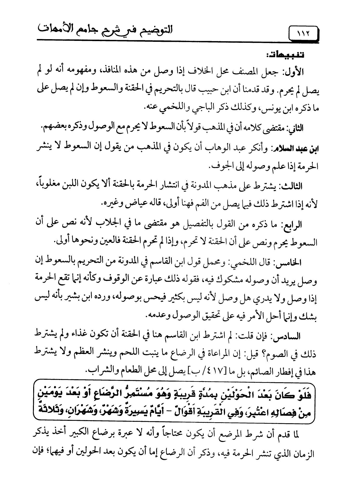 السادس: فإن قلت: لم اشترط ابن القاسم هنا في الحقنة أن تكون غذاء ولم يشترط ذلك في الصوم؟ قيل: إن المراعاة في الرضاع ما ينبت اللحم وينشر العظم ولا يشترط هذا في إفطار الصائم، بل ما [417/ب] يصل إلى محل الطعام والشراب.