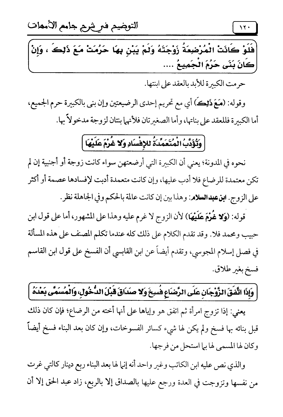 فَلَوْ كَانَتْ الْمُرْضِعَةُ زَوْجَتَهُ وَلَمْ يَبْنِ بِهَا حَرُمَتْ مَعَ ذَلِكَ، وَإِنْ كَانَ بَنَى حَرُمَ الْجَمِيعُ ....