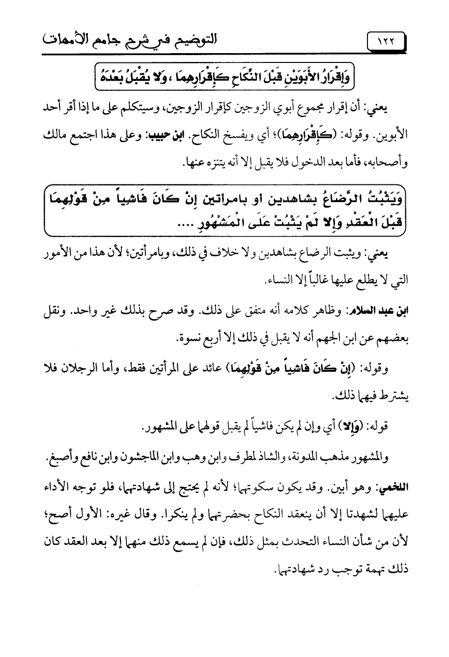 وَيَثْبُتُ الرَّضَاعُ بشاهدين أو بامرأتين إِنْ كَانَ فَاشِياً مِنْ قَوْلِهِمَا قَبْلَ الْعَقْدِ وَإِلا لَمْ يَثْبُتْ عَلَى الْمَشْهُورِ ....