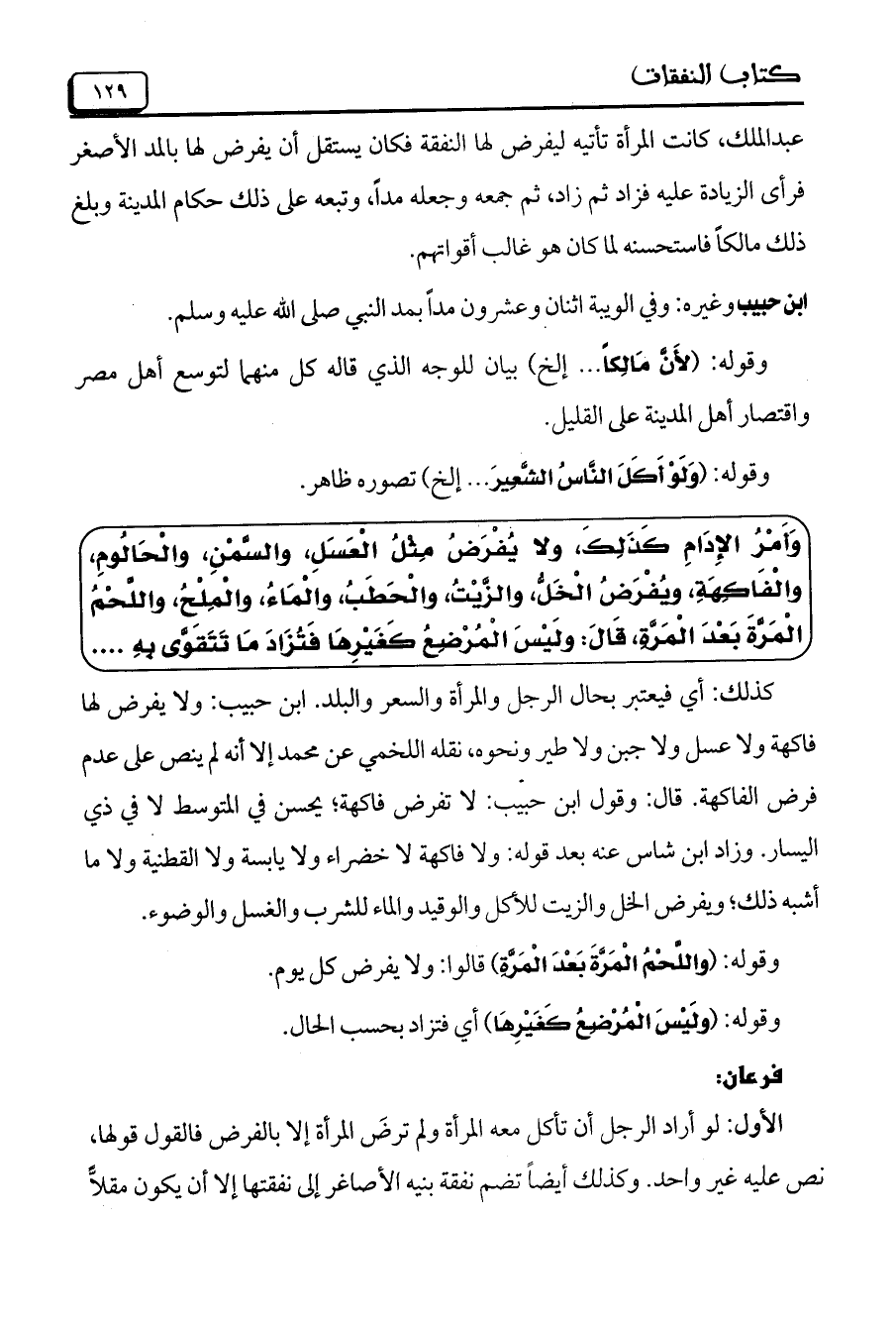 وَأَمْرُ الإِدَامِ كَذَلِكَ، ولا يُفْرَضُ مِثْلُ الْعَسَل، والسَّمْنِ، والْحَالُومِ، والْفَاكِهَةِ، ويُفْرَضُ الْخَلُّ، والزَّيْتُ، والْحَطُب، والْمَاءُ، والْمِلْحُ، واللَّحْمُ المْرَةَ بَعْدَ الْمَرَّةِ، قَالَ: ولَيْسَ الْمُرْضِعُ كَغَيْرِهَا فَتُزَادَ مَا تَتَقَوَّى بِهِ .....