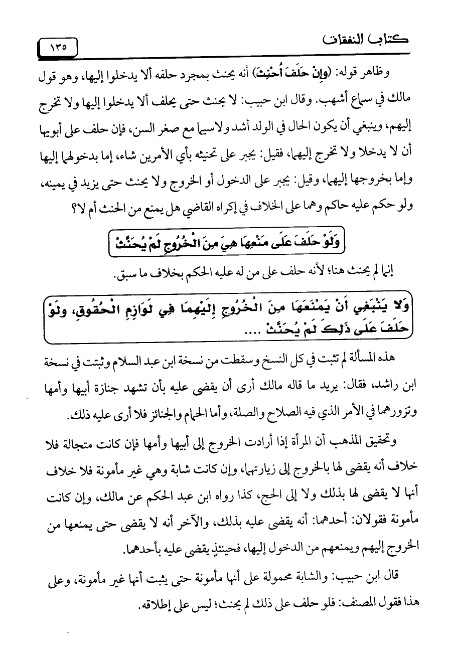 وَلا يَنْبَغِي أَنْ يَمْنَعَهَا مِنَ الْخُرُوجِ إِلَيْهِما فِي لَوَازِمِ الْحُقُوقِ: ولُوْ حَلَفَ عَلَى ذَلِكَ لَمْ يُحَنَّثْ ....