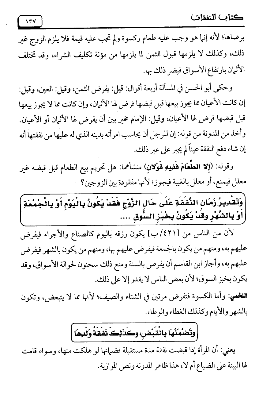 وَتَقْدِيرُ زَمَانِ النَّفَقَةِ عَلَى حَالِ الزَّوْجِ فَقَدْ يَكُونُ بِالْيَومِ أَوْ بِالْجُمُعَةِ أَوْ بِالشَّهْرِ وقَدْ يَكُونُ بِخُبْزِ السُّوقِ ....