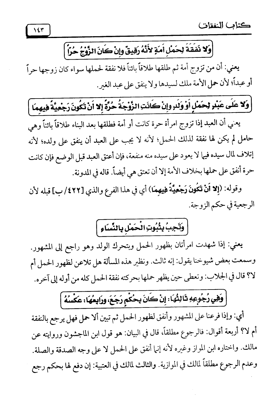 يعني أن العبد إذا تزوج امرأة حرة كانت أو أمة فطلقها بعد البناء طلاقاً بائناً وهي حامل لم يكن لها نفقة لذلك الحمل، لأنه لا يجب على العبد أن ينفق على ولده، لأنه إتلاف لمال سيده فيما لا يعود على سيده منه منفعة، فإن أعتق العبد قبل الوضع فإن كانت حرة أنفق على حملها بخلاف الأمة إلا أن تعتق هي أيضاً. قاله في المدونة.