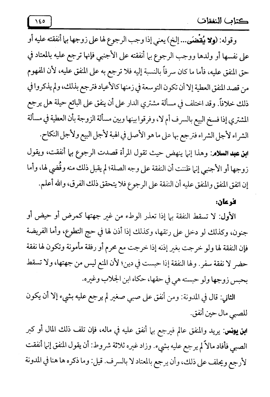 ابن عبد السلام: وهذا إنما ينهض حيث تقول المرأة قصدت الرجوع بما أنفقت، ويقول زوجها أو الأجنبي إنما ظننت أن النفقة على وجه الصلة، لم يقبل ذلك منه وقضي لها، وأما إن اتفق المنفق والمنفق عليه أن النفقة على الرجوع فلا يتحقق ذلك الفرق، والله أعلم.
