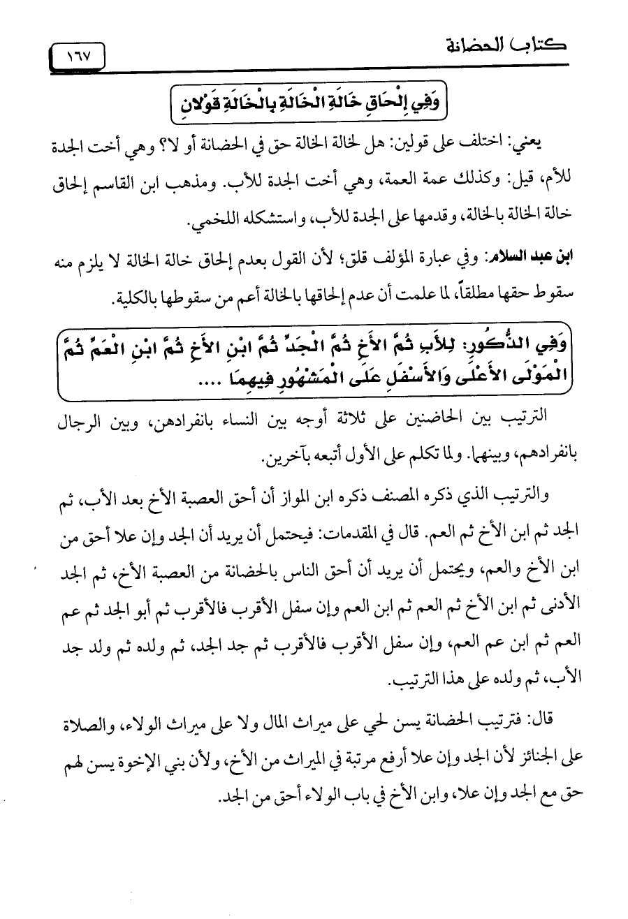 ابن عبد السلام: وفي عبارة المؤلف قلق، لأن القول بعدم إلحاق خالة الخالة لا يلزم منه سقوط حقها مطلقاً، لما علمت أن عدم إلحاقها بالخانة أعم من سقوطها بالكلية.