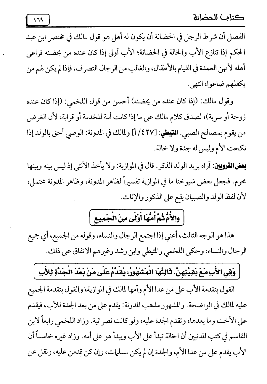 الفصل أن شرط الرجل في الحضانة أن يكون له أهل هو قول مالك في مختصر ابن عبد الحكم إذا تنازع الأب والخالة في الحضانة، الأب أولى إذا كان عنده من يحضنه فراعى أهله لأنهن العمدة في القيام بالأطفال، والغالب من الرجال التصرف، فإذا لم يكن لهم من يكفلهم ضاعوا، انتهى.