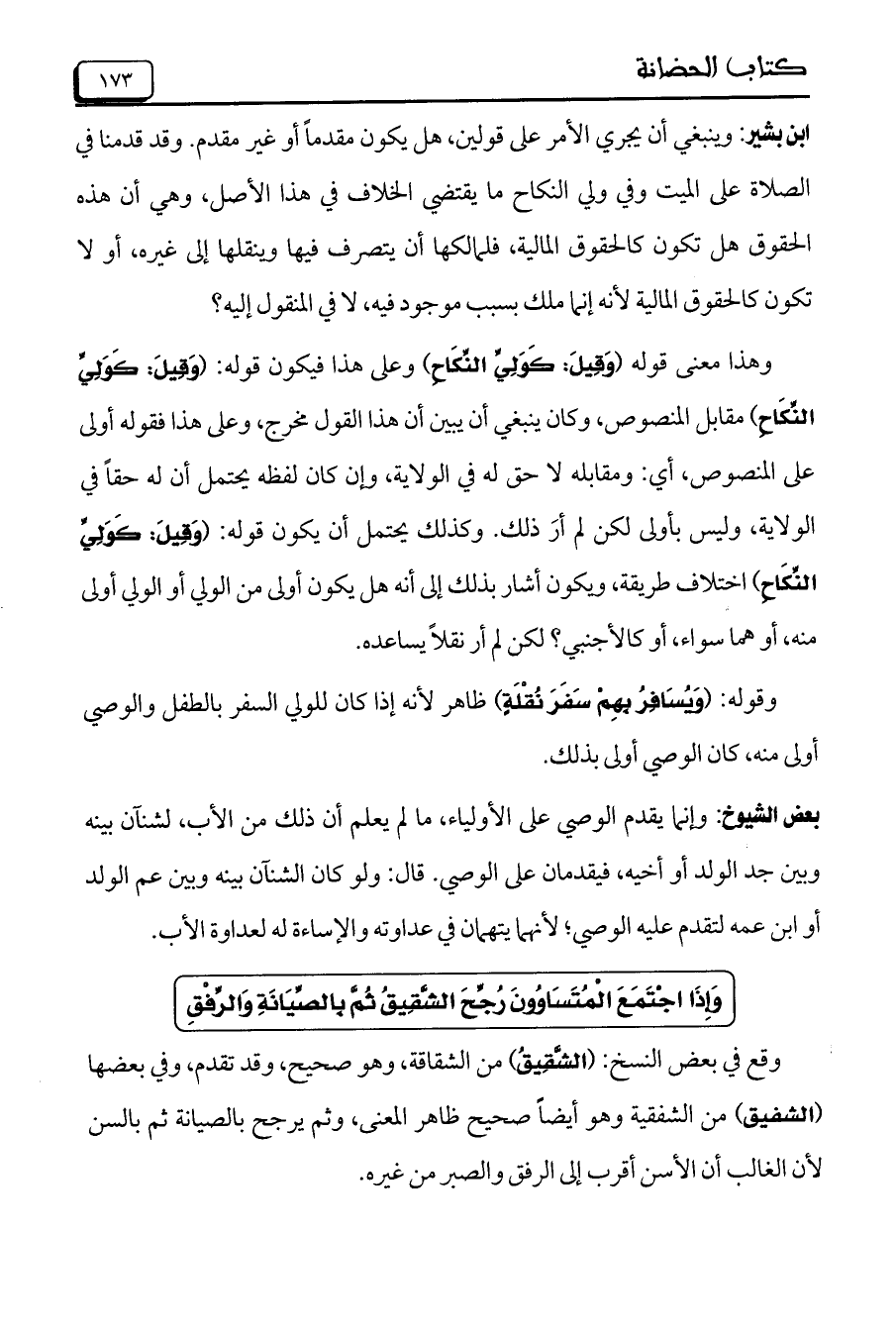 وقع في بعض السخ: (الشقيق) من الشقاقة، وهو صحيح، وقد تقدم، وفي بعضها (الشفيق) من الشفقية وهو أيضاً صحيح ظاهر المعنى، وثم يرجح بالصيانة ثم بالسن لأن الغالب أن الأسن أقرب إلى الرفق والصبر من غيره.