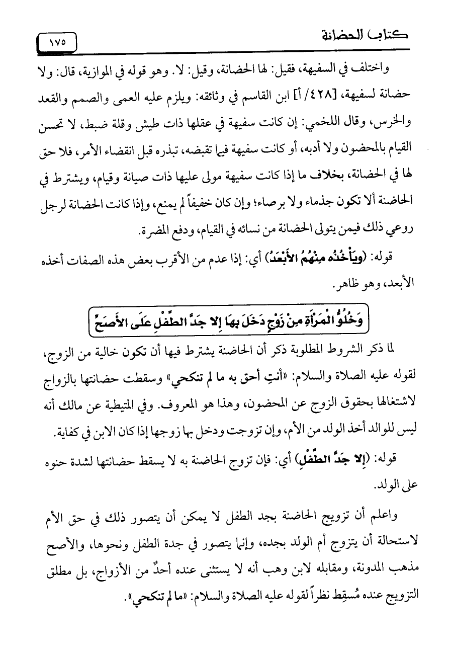 واختلف في السفيهة، فقيل: لها الحضانة، وقيل: لا. وهو قوله في الموازية، قال: ولا حضانة لسفيهة، [428/أ] ابن القاسم في وثائقه: ويلزم عليه العمى والصمم والقعد والخرس، وقال اللخمي: إن كانت سفيهة في عقلها ذات طيش وقلة ضبط، لا تحسن القيام بالمحضون ولا أدبه، أو كانت سفيهة فيما تقبضه، تبذره قبل انقضاء الأمر، فلا حق لها في الحضانة، بخلاف ما إذا كانت سفيهة مولى عليها ذات صيانة وقيام، ويشترط في الحاضنة ألا تكون جذماء ولا برصاء، وإن كان خفيفاً لم يمنع، وإذا كانت الحضانة لرجل روعي ذلك فيمن يتولى الحضانة من نسائه في القيام، ودفع المضرة.