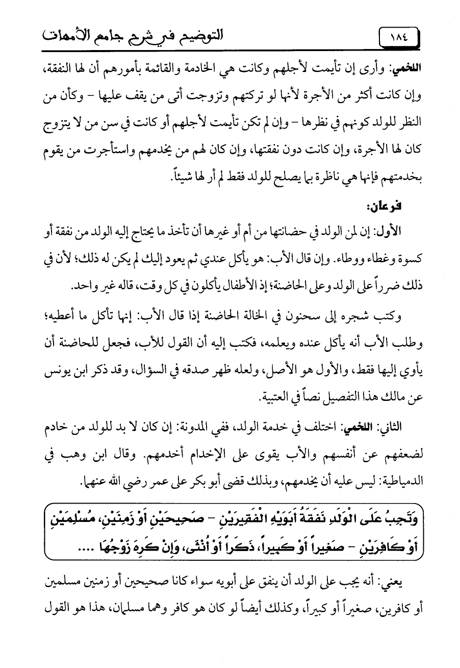 الثاني: اللخمي: اختلف في خدمة الولد، ففي المدونة: إن كان لابد للولد من خادم لضعفهم عن أنفسهم والأب يقوى على الإخدام أخدمهم. وقال ابن وهب في الدمياطية: ليس عليه أن يخدمهم، وبذلك قضي أبو بكر على عمر رضي الله عنهما.