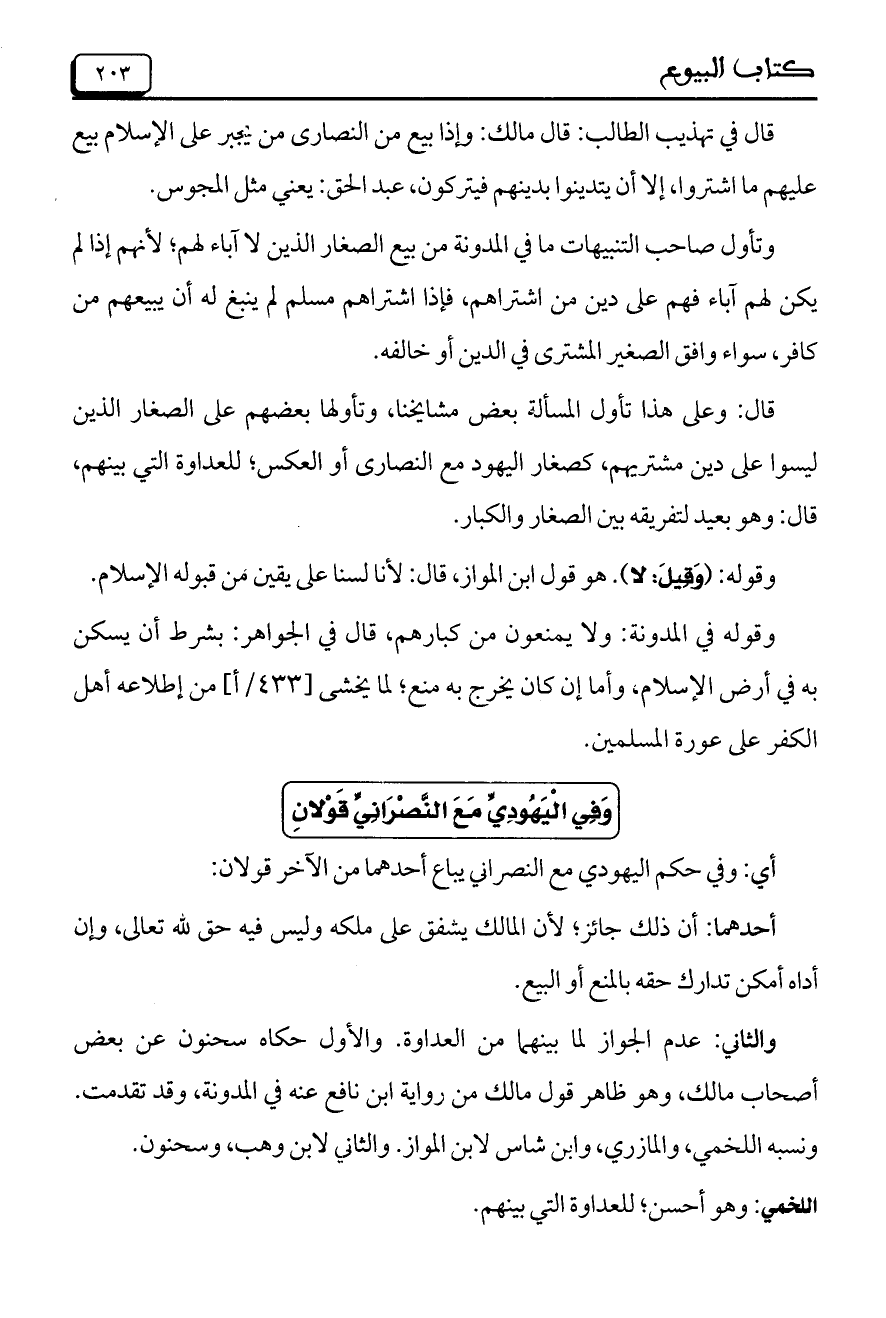 قال: وعلى هذا تأول المسألة بعض مشايخنا، وتأولها بعضهم على الصغار الذين ليسوا على دين مشتريهم، كصغار اليهود مع النصارى أو العكس، للعداوة التي بينهم، قال: وهو بعيد لتفريقه بين الصغار والكبار.