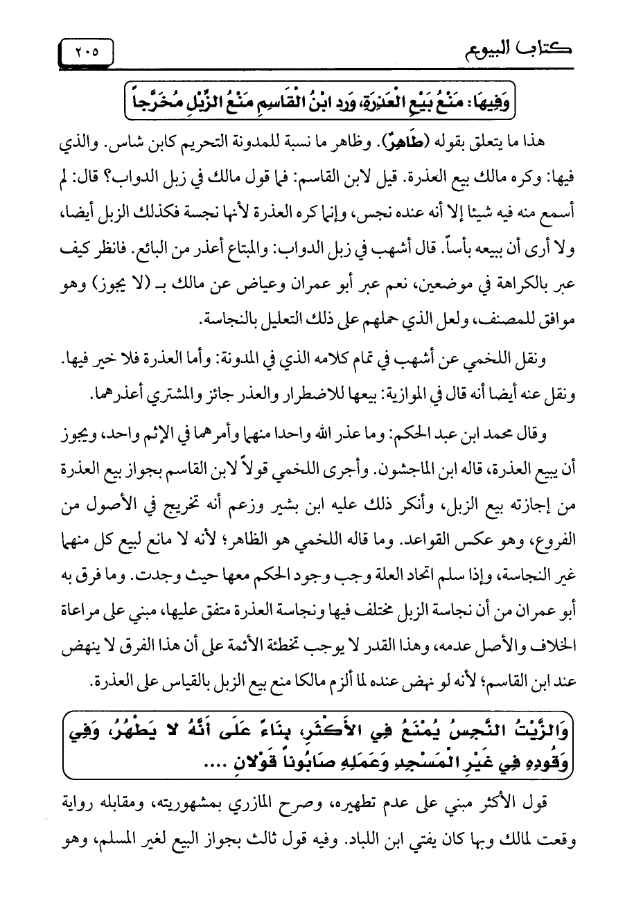 وقال محمد ابن عبد الحكم: وما عذر الله واحداً منهما وأمرهما في الإثم واحد، ويجوز أن يبيع العذرة، قاله ابن الماجشون. وأجرى اللخمي قولاً لابن القاسم بجواز بيع العذرة من إجازته بيع الزبل، وأنكر ذلك عليه ابن بشير وزعم أنه تخريج في الأصول من الفروع، وهو عكس القواعد. وما قاله اللخمي هو الظاهر، لأنه لا مانع لبيع كل منهما غير النجاسة، وإذا سلم اتحاد العلة وجب وجود الحكم معها حيث وجدت. وما فرق به أبو عمران من أن نجاسة الزبل مختلف فيها ونجاسة العذرة متفق عليها، مبني على مراعاة الخلاف والأصل عدمه، وهذا القدر لا يوجب تخطئة الأئمة على أن هذا الفرق لا ينهض عند ابن القاسم، لأنه لو نهض عنده لما ألزم مالكاً منع بيع الزبل بالقياس على العذرة.