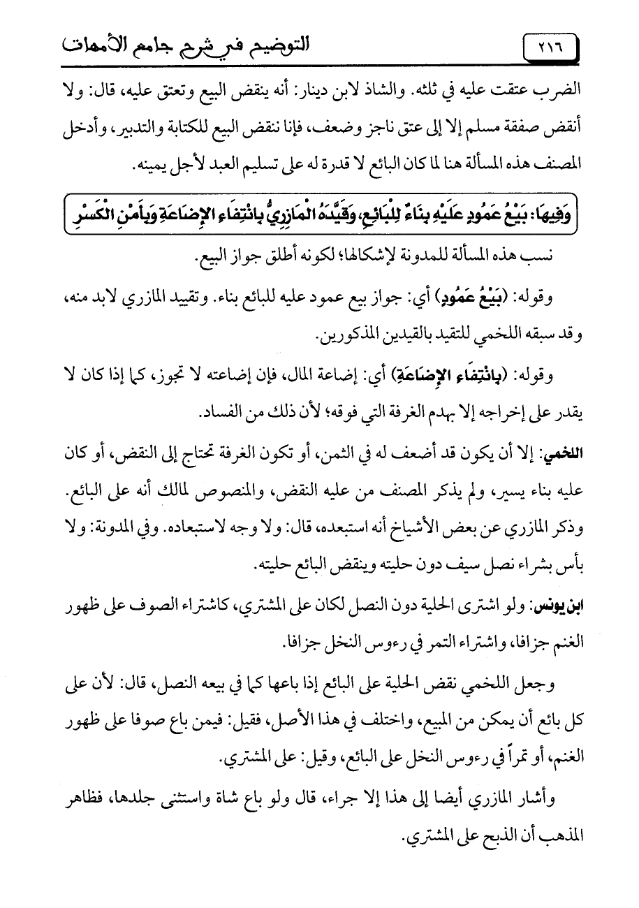 وفيها: بيع عمود عليه بناء للبائع وقيده المازري بانتفاء الإضاعة وبأمن الكسر