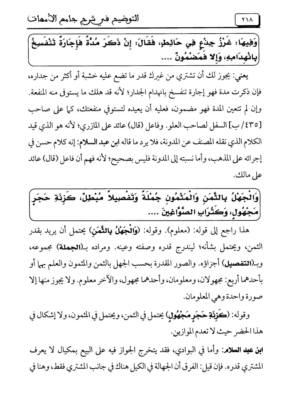 هذا راجع إلى قوله: (معلوم). وقوله: (والجهل بالثمن) يحتمل أن يريد بقدر الثمن، ويحتمل بشأنه، ليندرج قدره وصفته وعينه. ومراده بـ (الجملة) مجموعة، وبـ (التفصيل) أجزاؤه. والصور المقدرة بحسب الجهل بالثمن والمثمون والعلم بهما أو بأحدهما أربع: مجهولان، ومعلومان، وأحدهما مجهول، والآخر معلوم، ولا يجوز منها إلا صورة واحدة وهي المعلومان.