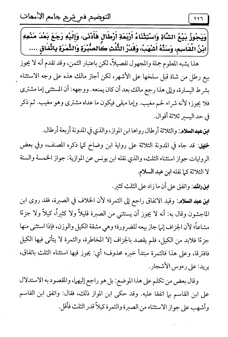 ويجوز بيع الشاة واستثناء أربعة أرطال فأدنى، وإليه رجع بد منعه ابن القاسم، وسنه أشهب، وقدر الثلث كالصبرة والثمرة باتفاق ....