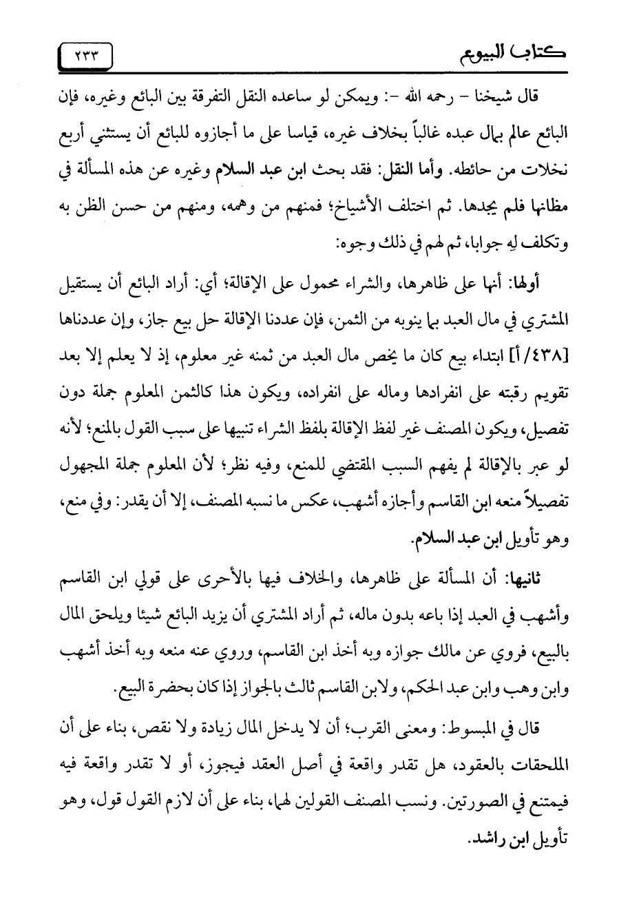 قال شيخنا- رحمه الله-: ويمكن لو ساعده النقل التفرقة بين البائع وغيره، فإن البائع عالم بمال عبده غالباً بخلاف غيره، قياساً على ما أجازوه للبائع أن يستثني أربع نخلات من حائطه. وأما النقل: فقد بحث ابن عبد السلام وغيره عن هذه المسالة في مظانها فلم يجدها. ثم اختلف الأشياخ، فمنهم من وهمه، ومنهم من حسن الظن به وتكلف له جواباً، ثم لهم في ذلك وجوه: