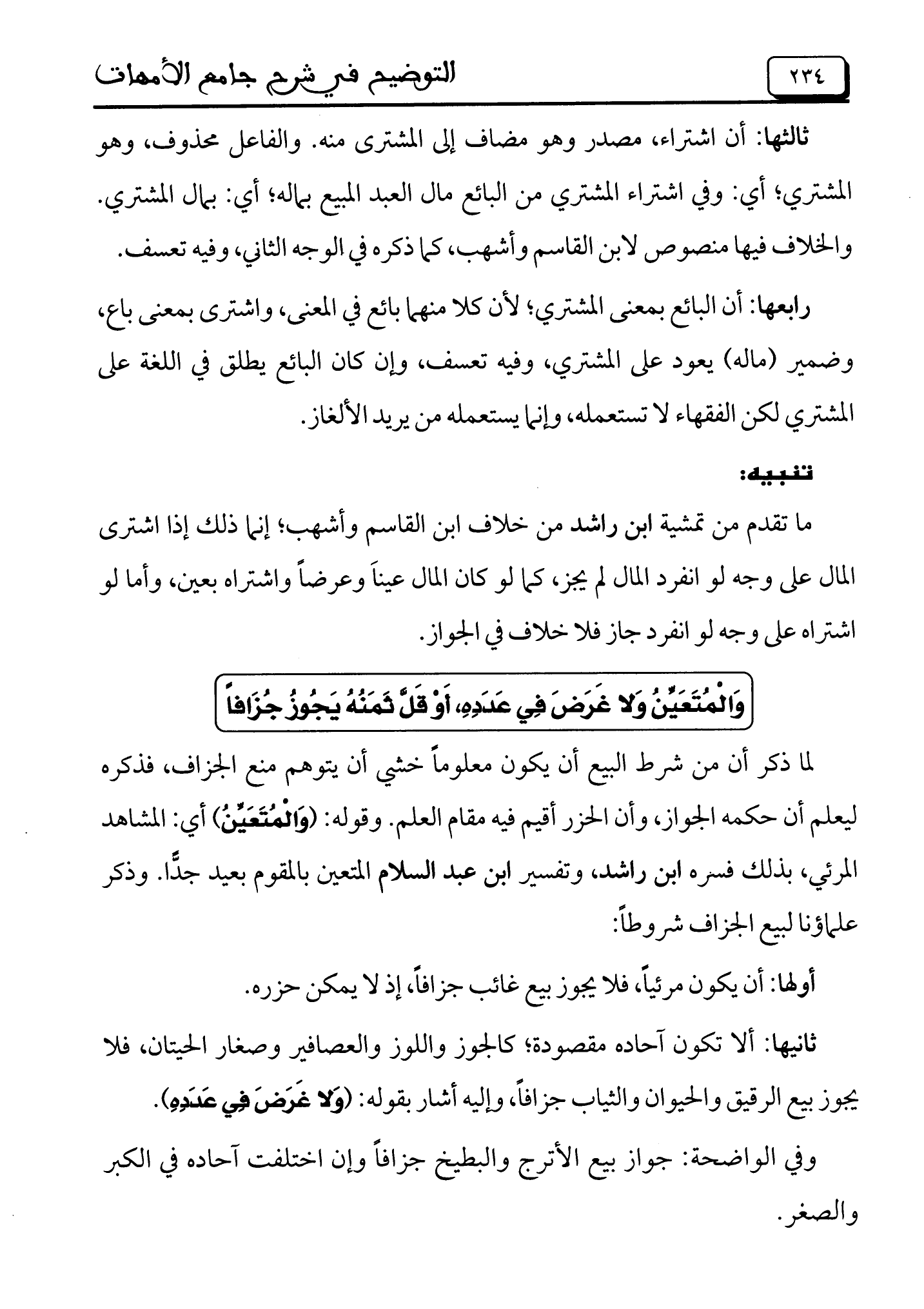 ما تقدم من تمشية ابن راشد من خلاف ابن القاسم وأشهب، إنما ذلك إذا اشترى المال على وجه لو انفرد المال لم يجز، كما لو كان المال عيناً وعرضاً واشتراه بعين، وأما لو اشتراه على وجه لو انفرد جاز فلا خلاف في الجواز.