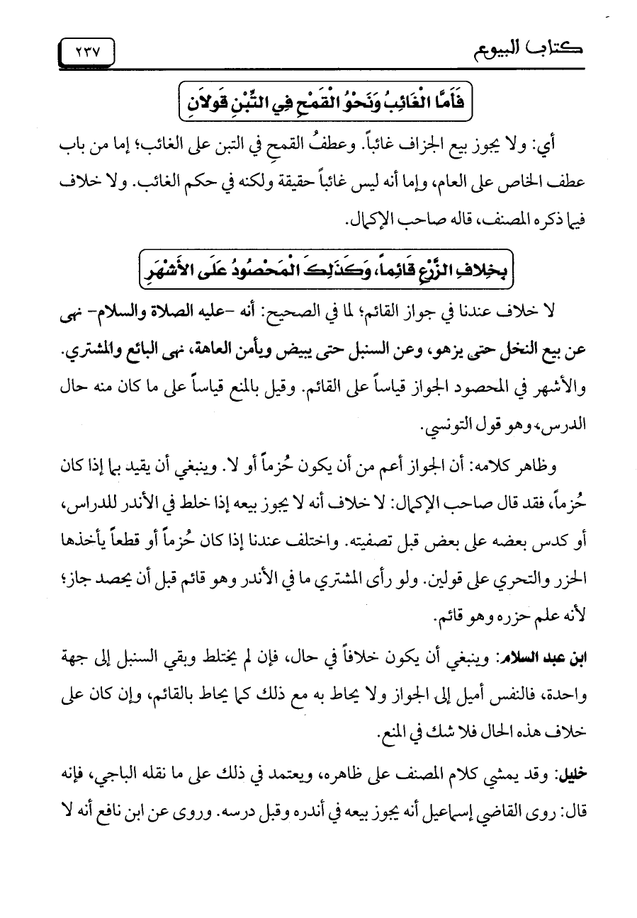 ابن عبد السلام: وينبغي أن يكون خلافاً في حال، فإن لم يختلط وبقي السنبل إلى جهة واحدة، فالنفس أميل إلى الجواز ولا يحاط به مع ذلك كما يحاط بالقائم، وإن كان على خلاف هذه الحال فلا شك في المنع.