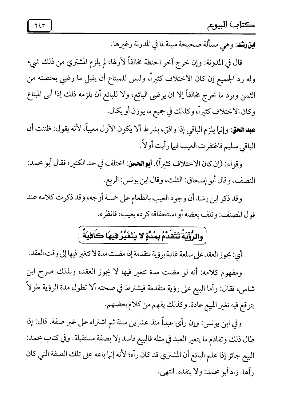 ومفهوم كلامه: أنه لو مضت مدة تتغير فيها لا يجوز العقد، وبذلك صرح ابن شاس، فقال: وأما البيع على رؤية متقدمة فيشترط في صحته ألا تطول مدة الرؤية طولاً يتوقع فيه تغير المبيع عادة. وكذلك يفهم من كلام بعضهم.