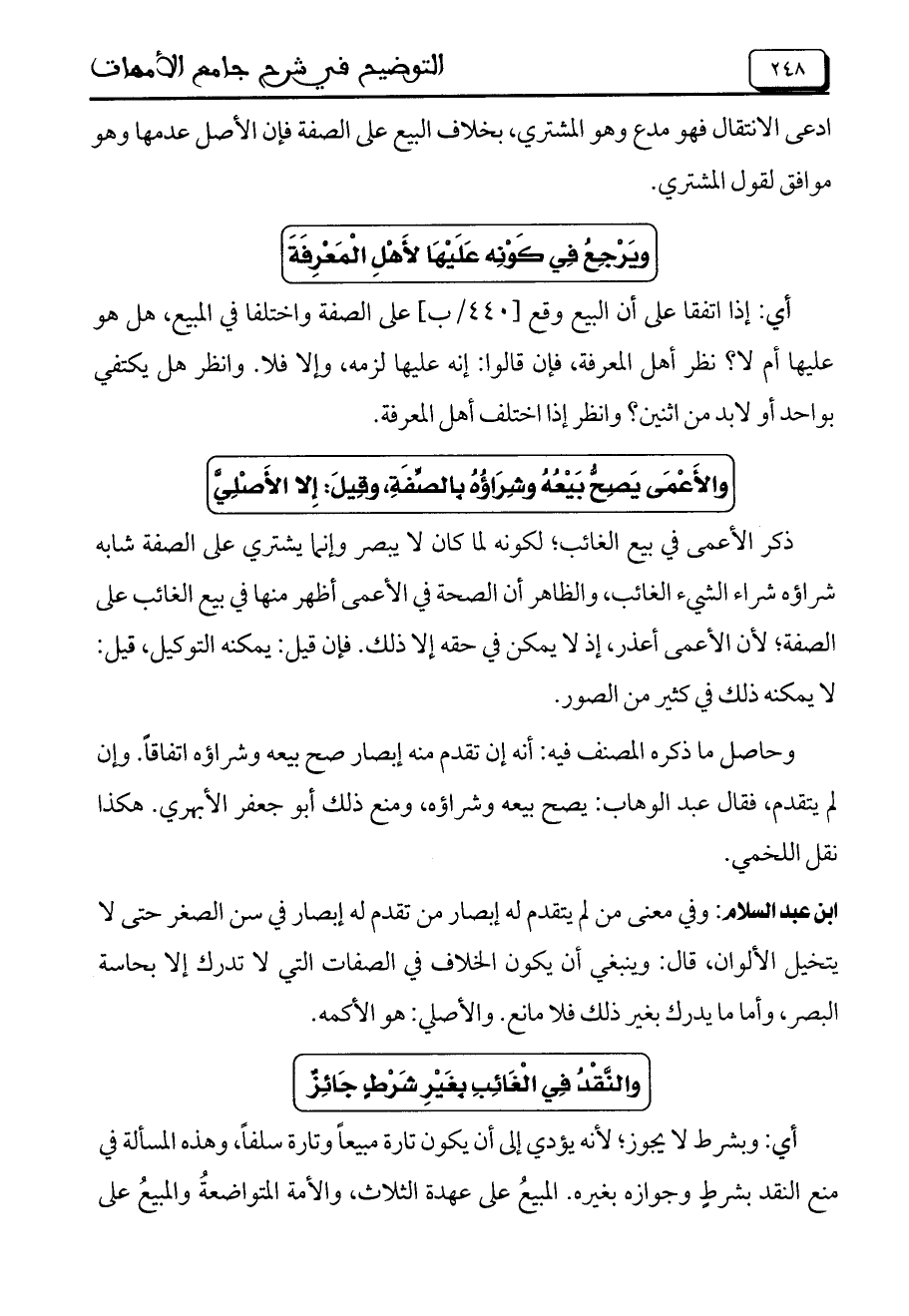 ذكر الأعمى في بيع الغائب، لكونه لما كان لا يبصر وإنما يشتري على الصفة شابه شراؤه شراء الشيء الغائب، والظاهر أن الصحة في الأعمى أظهر منها في بيع الغائب على الصفة، لأن الأعمى أعذر، إذ لا يمكن في حقه إلا ذلك. فإن قيل: يمكنه التوكيل، قيل: لا يمكنه ذلك في كثير من الصور.