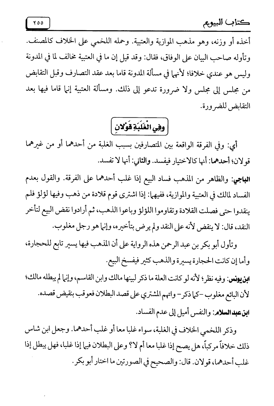 ابن يونس: وفيه نظر، لأنه لو كانت العلة ما ذكر لبينها مالك وابن القاسم، وإنما لم يبطله مالك، لأن البائع مغلوب- كما ذكر- واتهم المشتري على قصد البطلان فعوقب بنقيض قصده.