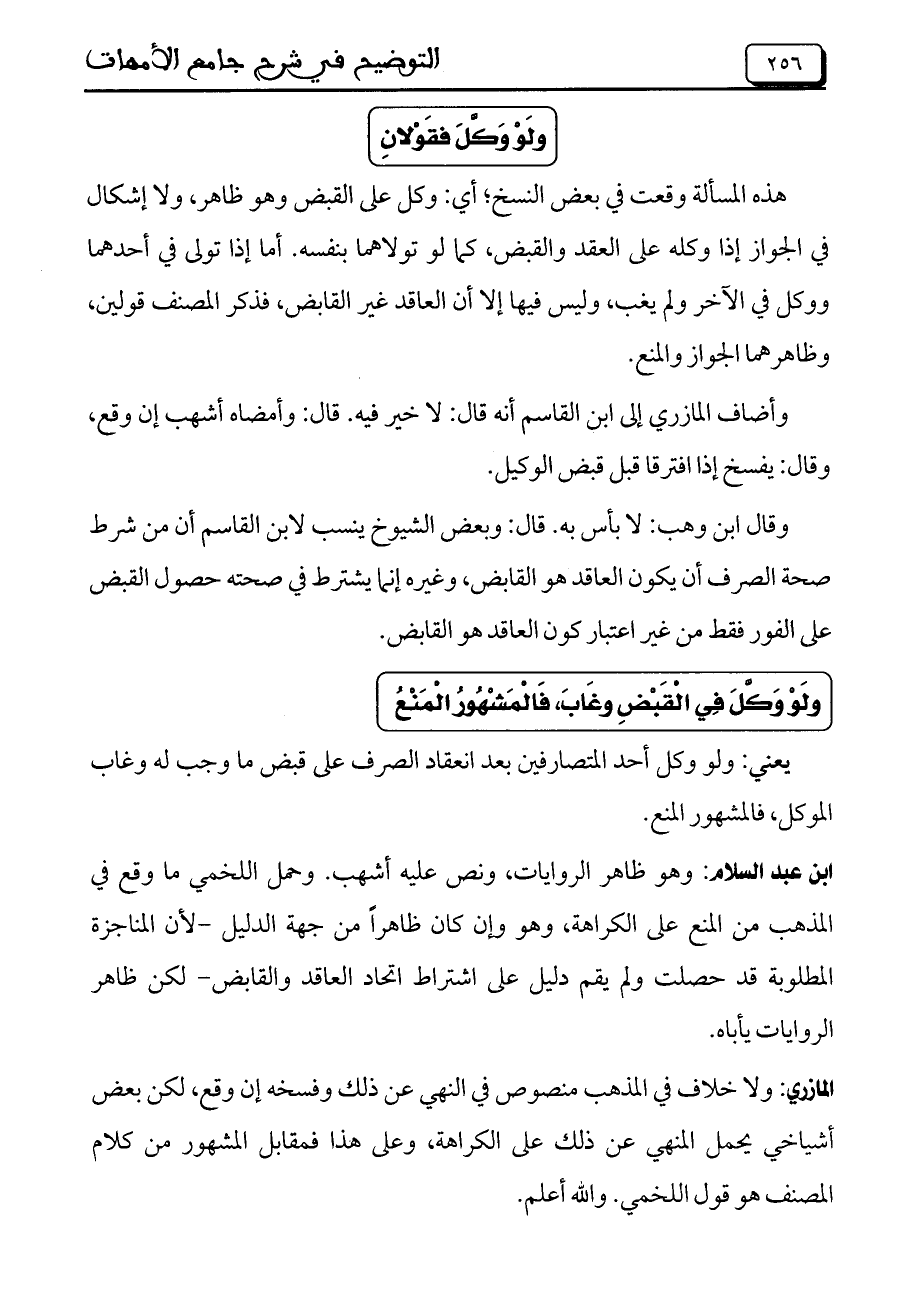ابن عبد السلام: وهو ظاهر الروايات ونص عليه أشهب. وحمل اللخمي ما وقع في المذهب من المنع على الكراهة، وإن كان ظاهراً من جهة الدليل- لأن المناجزة المطلوبة قد حصلت ولم يقم دليل على اشتراط اتحاد العاقد والقابض- لكن ظاهر الروايات يأباه.