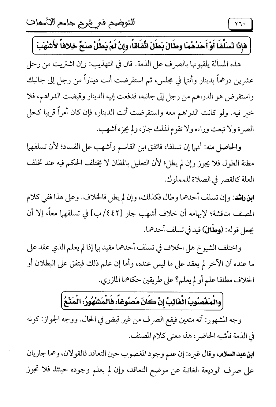 والحاصل منه: أنهما إن تسلفا، فاتفق ابن القاسم وأشهب على الفساد، لأن تسلفهما مظنة الطول فلا يجوز وإن لم يطل، لأن التعليل بالمظان لا يختلف الحكم فيه عند تخلف العلة كالقصر في الصلاة للمملوك.