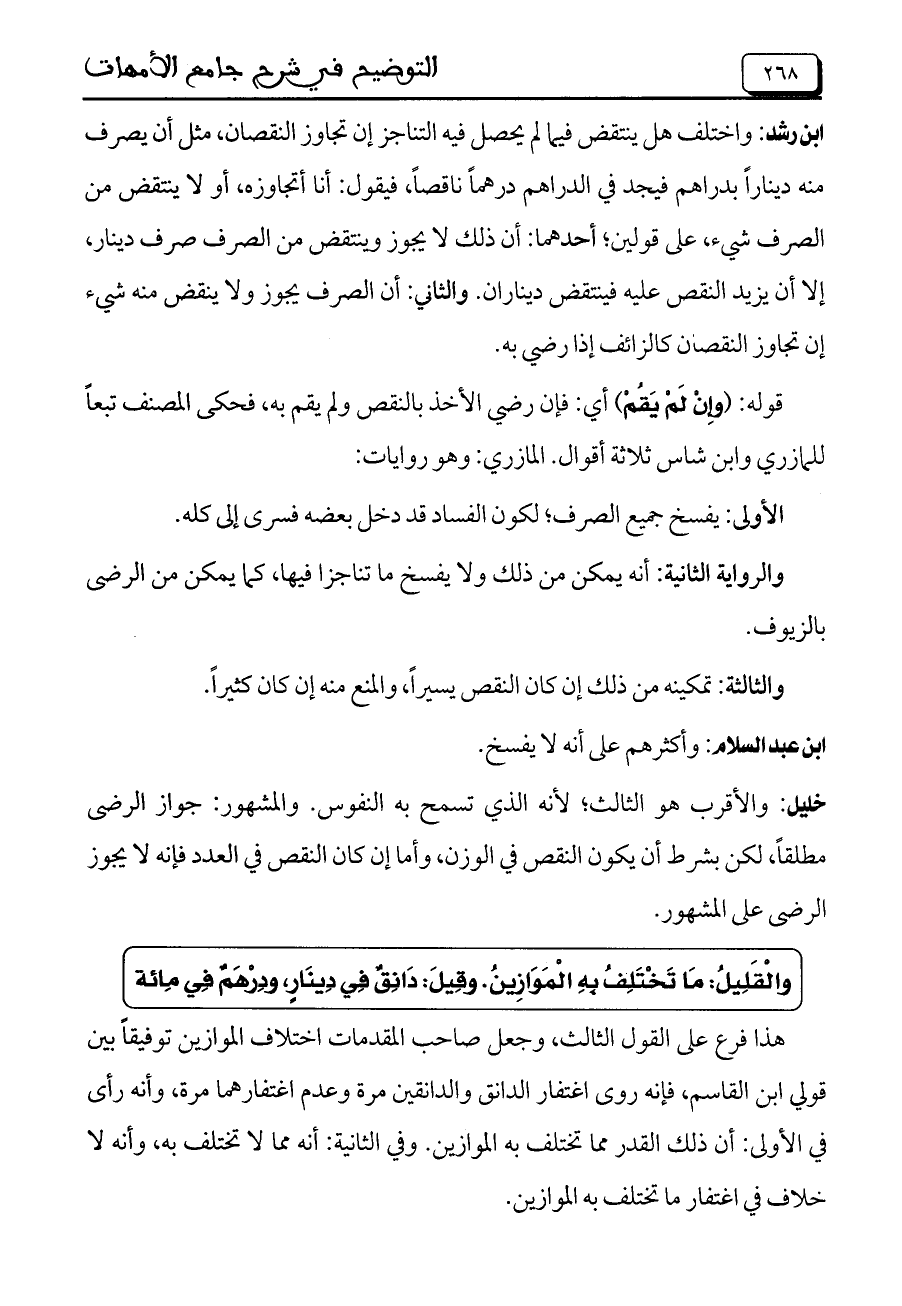 ابن رشد: واختلف هل ينتقض فيما لم يحصل فيه التناجز إن تجاوز النقصان، مثل أن يصرف منه ديناراً بدراهم فيجد في الدراهم درهماً ناقصاً، فيقول: أنا أتجاوزه، أو لا ينتقض من الصرف شيء، على قولين، أحدهما: أن ذلك لا يجوز وينتقض من الصرف صرف دينار، إلا أن يزيد النقص عليه فينتقض ديناران. والثاني: أن الصرف يجوز ولا ينتقض منه شيء إن تجاوز النقصان كالزائف إذا رضي به.