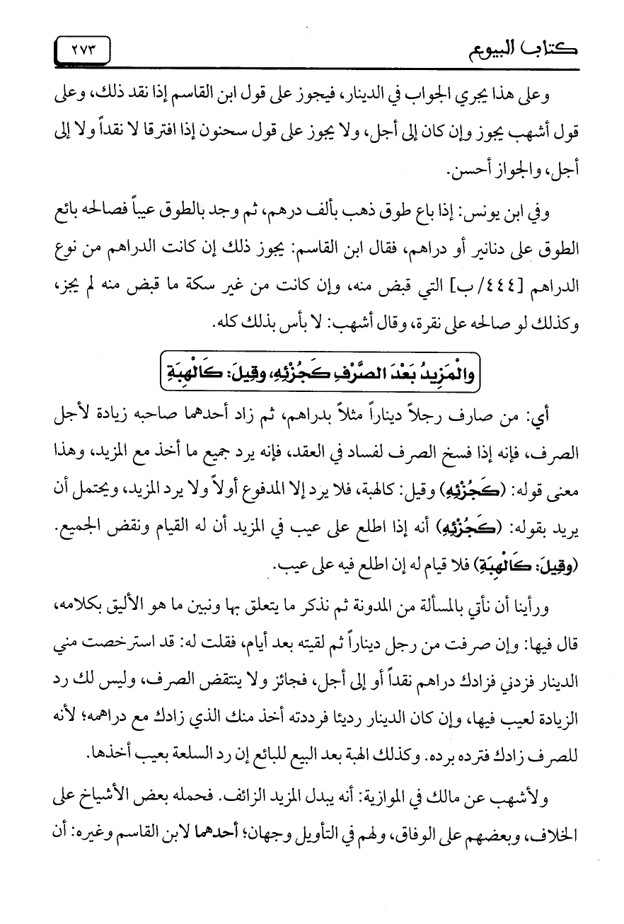 ورأينا أن نأتي بالمسألة من المدونة ثم نذكر ما يتعلق بها ونبين ما هو الأليق بكلامه، قال فيها: وإن صرفت من رجل ديناراً ثم لقيته بعد أيام، فقلت له: قد استرخصت مني الدينار فزدني فزادك دراهم نقداً أو إلى أجل، فجائز ولا ينتقض الصرف، وليس لك رد الزيادة لعيب فيها، وإن كان الدينار رديئاً فرددته أخذ منك الذي زادك مع دراهمه، لأنه للصرف زادك فترده برده. وكذلك الهبة بعد البيع للبائع إن رد السلعة بعيب أخذها.