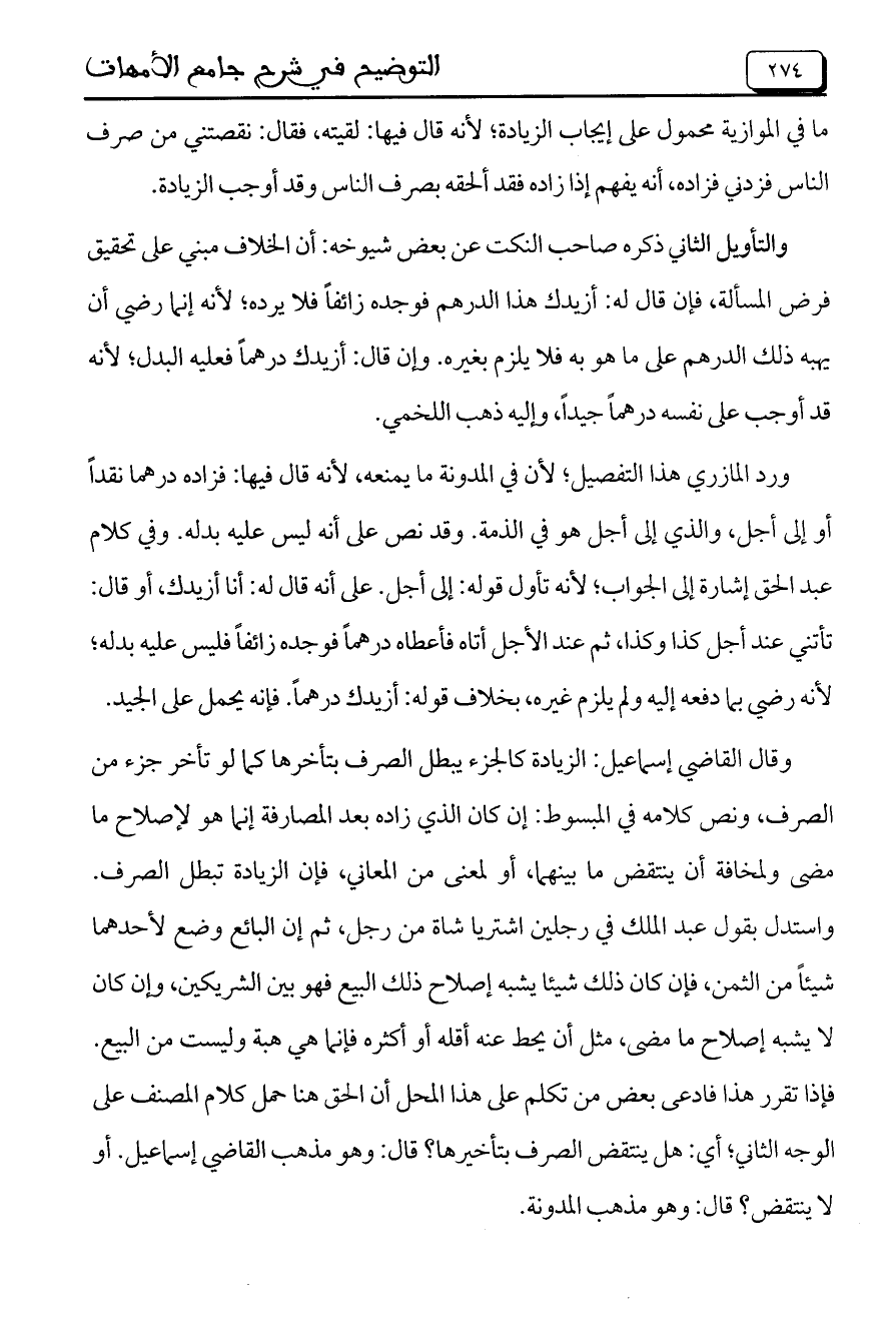 وقال القاضي إسماعيل: الزيادة كالجزء يبطل الصرف بتأخرها كما لو تأخر جزء من الصرف، ونص كلامه في المبسوط: إن كان الذي زاده بعد المصارفة إنما هو لإصلاح ما مضى ولمخالفة أن ينتقض ما بينهما، أو لمعنى من المعاني، فإن الزيادة تبطل الصرف. واستدل بقول عبد الملك في رجلين اشتريا شاة من رجل، ثم إن البائع وضع لأحدهما شيئاً من الثمن، فإن كان ذلك شيئاً يشبه إصلاح ذلك البيع فهو بينه الشريكين، وإن كان لا يشبه إصلاح ما مضى، مثل أن يحط عنه أقله أو أكثره فإنما هي هبة وليست من البيع. فإذا تقرر هذا فادعى بعض من تكلم على هذا المحل أن الحق هنا حمل كلام المصنف على الوجه الثاني، أي: هل ينتقض الصرف بتأخيرها؟ قال: وهو مذهب القاضي إسماعيل. أو لا ينتقض؟ قال: وهو مذهب المدونة.