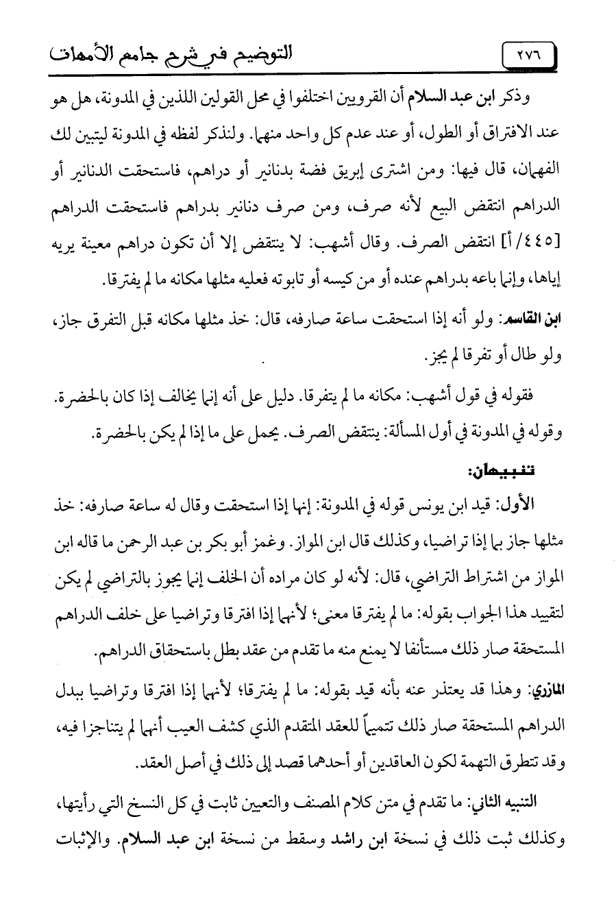 التنبيه الثاني: ما تقدم في متن كلام المصنف والتعيين ثابت في كل النسخ التي رأيتها، وكذلك ثبت ذلك في نسخة ابن رشد وسقط من نسخة ابن عبد السلام. والإثبات