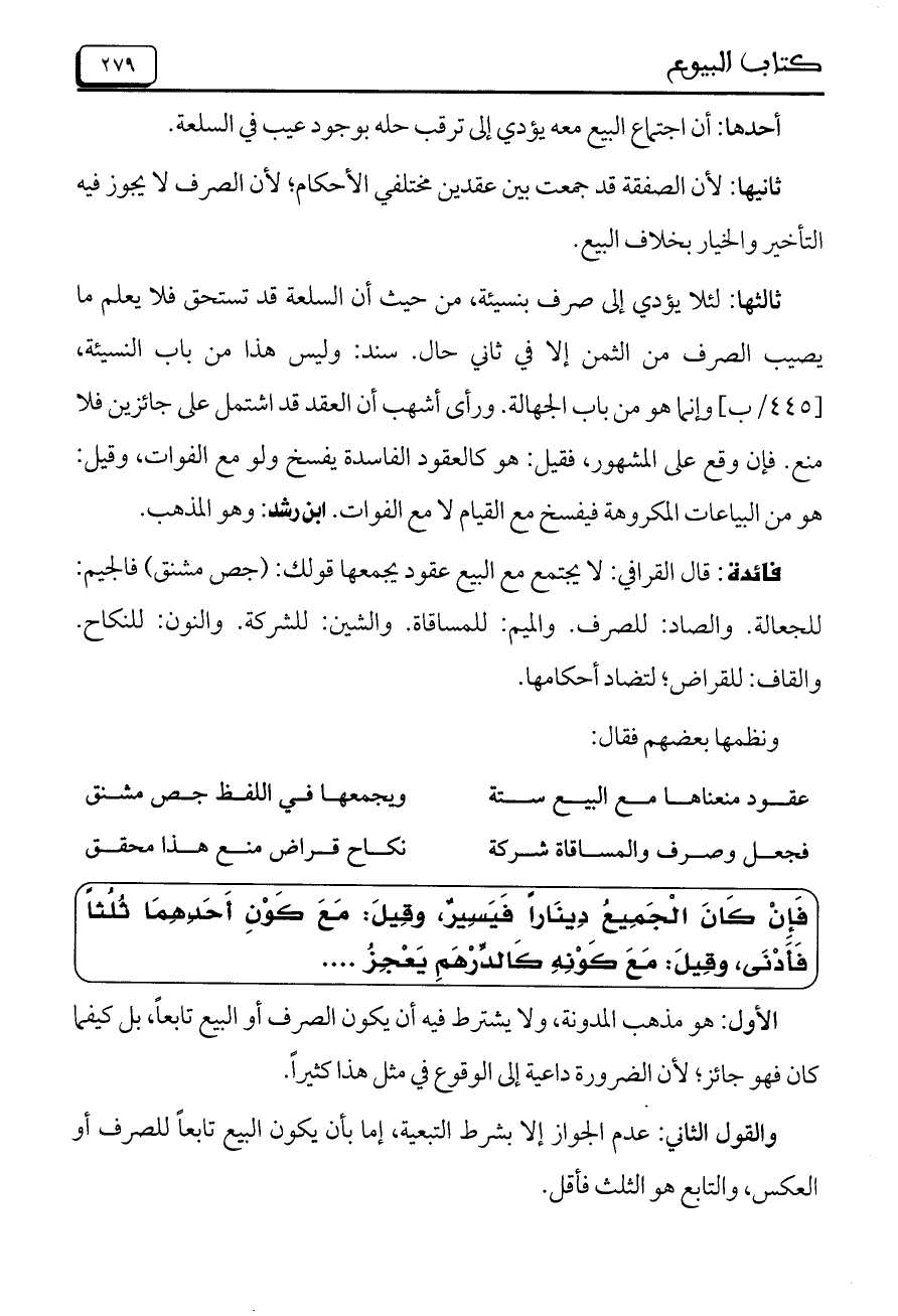 فائدة: قال القذافي: لا يجتمع مع البيع يجمعها قولك: (جص مشنق) فالجيم: للجعالة. والصاد: للصرف، والميم: للمساقاة. والشين: للشركة. والنون: للنكاح والقاف: للقراض، لتضاد أحكامها.