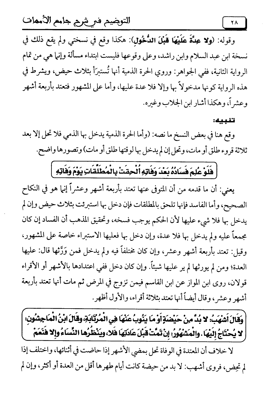 وقوله: (ولا عِدَّةَ عَلَيْهَا قَبْلَ الدُّخُولِ): هكذا وقع في نسختي ولم يقع ذلك في نسخة ابن عبد السلام وابن راشد، وعلى وقوعها فليست ابتداء مسألة وإنما هي من تمام الرواية الثانية، ففي الجواهر: وروي الحرة الذمية أنها تستبرأ بثلاث حيض، ويشرط في هذه الرواية كونها مدخولاً بها وإلا فلا عدة عليها، وأما على المشهور فتعتد بأربعة أشهر وعشراً، وهكذا أشار ابن الجلاب وغيره.