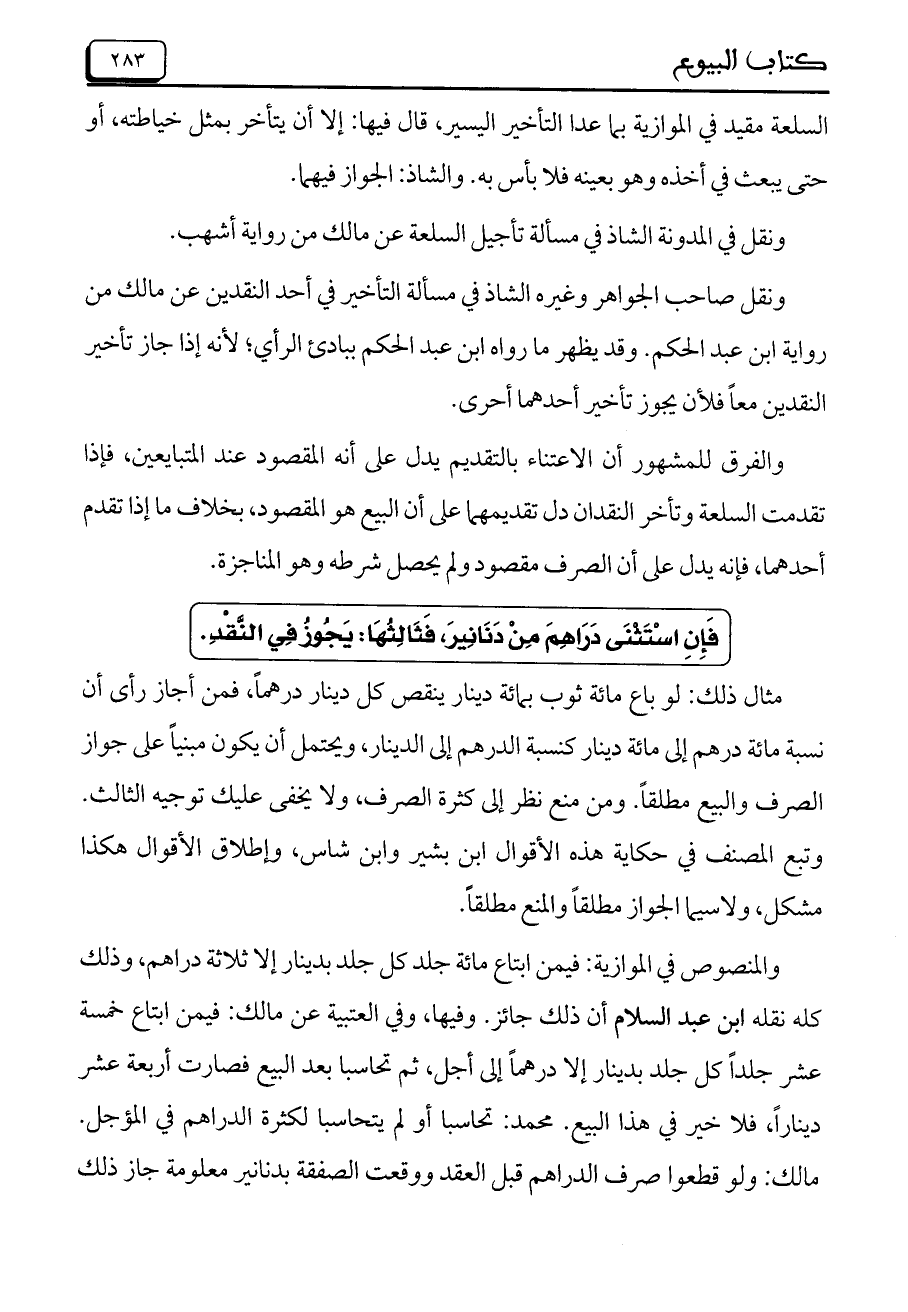 ونقل صاحب الجواهر وغيره الشاذ في مسألة التأخير في أحد النقدين عن مالك من رواية ابن عبد الحكم. وقد يظهر ما رواه ابن عبد الحكيم ببادئ الرأي، لأنه إذا جاز تأخير النقدين معاً فلأن يجوز تأخير أحدهما أحرى.