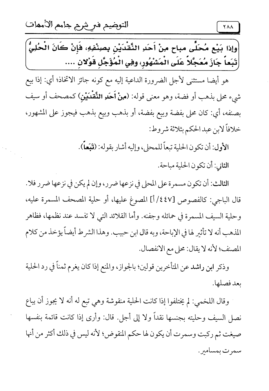 هو أيضاً مستثنى لأجل الضرورة الداعية إليه مع كونه جائز الاتخاذ، أي: إذا بيع شيء محلى بذهب أو فضة، وهو معنى قوله: (من أحد النقدين) كمصحف أو سيف بصنفه، أي: كان محلى بفضة وبيع بفضة، أو بذهب وبيع بذهب فيجوز على المشهور، خلافاً لابن عبد الحكم بثلاثة شروط: