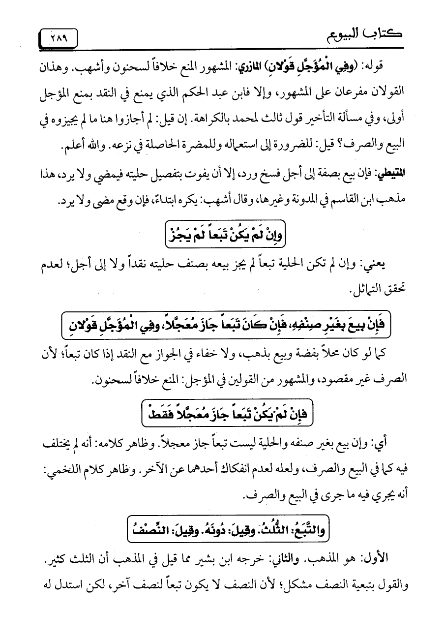 كما لو كان محلاً بفضة وبيع بذهب، ولا خفاء في الجواز مع النقد إذا كان تبعاً، لأن الصرف غير مقصود، والمشهور من القولين في المؤجل: المنع خلافاً لسحنون.