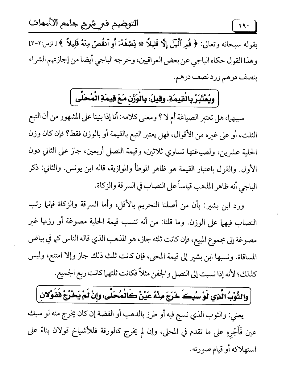ورد ابن بشير: بأن من أصلنا التحريم بالأقل، وأما السرقة والزكاة فإنا رتب النصاب فيهما على الوزن. وما قلنا: من أنه تنسب قيمة الحلية مصوغة أو وزنها غير مصوغة إلى مجموع المبيع، فإن كانت ثلثه جاز، هو المذهب الذي قاله الناس كما في بياض المساقاة. ونسبها ابن بشير إلى قيمة المحلى، فإن كانت ثلث ذلك جاز وإلا امتنع، وليس كذلك، لأنه إذا نسبت إلى النصل والجفن مثلاً فكانت ثلثهما كانت ربع الجميع.