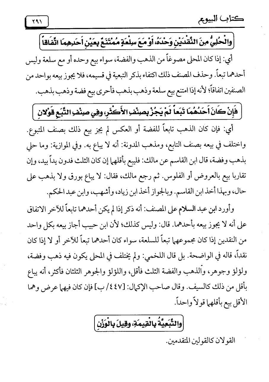 وأورد ابن عبد السلام على المصنف: أنه ذكر إذا لم يكن أحدهما تابعاً للآخر الاتفاق على أنه لا يجوز بيعه بأحدهما. قال: وليس كذلك، لأن ابن حبيب أجاز بيعه بكل واحد من النقدين إذا كان مجموعهما تبعاً للسلعة، سواء كان أحدهما تبعاً للآخر أو لا إذا كان نقداً، قاله في الواضحة. بل قال اللخمي: ولم يختلف في المحلى يكون فيه ذهب وفضة، ولؤلؤ وجوهر، والذهب والفضة الثلث فأقل، واللؤلؤ والجوهر الثلثان فأكثر، أنه يباع بأقل من ذلك كالسيف. وقال صاحب الإكمال: [447/ب] فإن كان فيهما عرض وهما الأقل بيع بأقلهما قولاً واحداً.