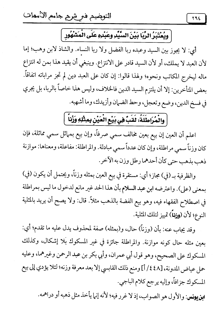 وقد يجاب عنه: بأن (وزناً) حال، و (بمثله) صفة لمحذوف يدل عليه ما تقدم، أي: بعين مثله حال كونه موازنة. والمراطلة جائزة في غير المسكوك بلا إشكال، وكذلك المسكوك على الصحيح، وهو قول أبي عمران، وأبي بكر بن عبد الرحمن وغيرهما، وعليه حمل عياض المدونة، [448/أ] ومنع ذلك القابسي إلا بعد معرفة وزنه، لئلا يؤدي إلى بيع المسكوك جزافاً، وإليه يرجع كلام الباجي.
