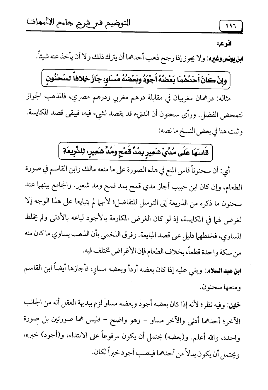 مثاله: درهمان مغربيان في مقابلة درهم مغربي ودرهم مصري، فالمذهب الجواز لتمحض الفضل. ورأى سحنون أن الدنئ قد يقصد لشيء فيه، فيبقى قصد المكايسة. وثبت هنا في بعض النسخ ما نصه: