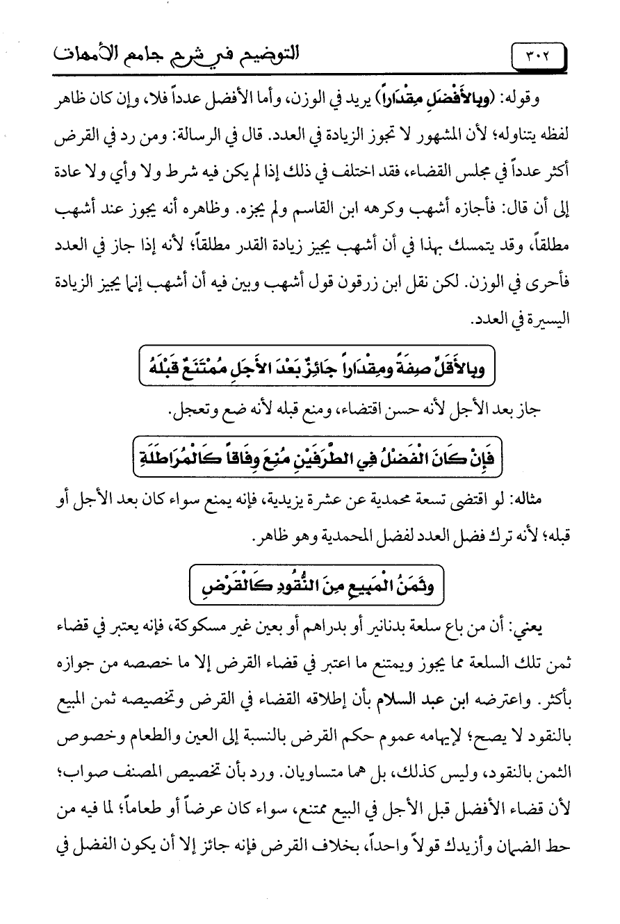 وقوله: (وبالأفضل مقداراً) يريد في الوزن، وأما الأفضل عداً فلا، وإن كان ظاهر لفظه يتناوله، لأن المشهور لا تجوز الزيادة في العدد. قال في الرسالة: ومن رد في القرض أكثر عدداً في مجلس القضاء، فقد اختلف في ذلك إذا لم يكن فيه شرط ولا وأي ولا عادة إلى أن قال: فأجازه أشهب وكرهه ابن القاسم ولم يجزه. وظاهره أنه يجوز عند أشهب مطلقاً، وقد يتمسك بهذا في أن أشهب يجيز زيادة القدر مطلقاً، لأنه إذا جاز في العدد فأحرى في الوزن. لكن نقل ابن زرقون قول أشهب وبين فيه أن أشهب إنما يجيز الزيادة اليسيرة في العدد.