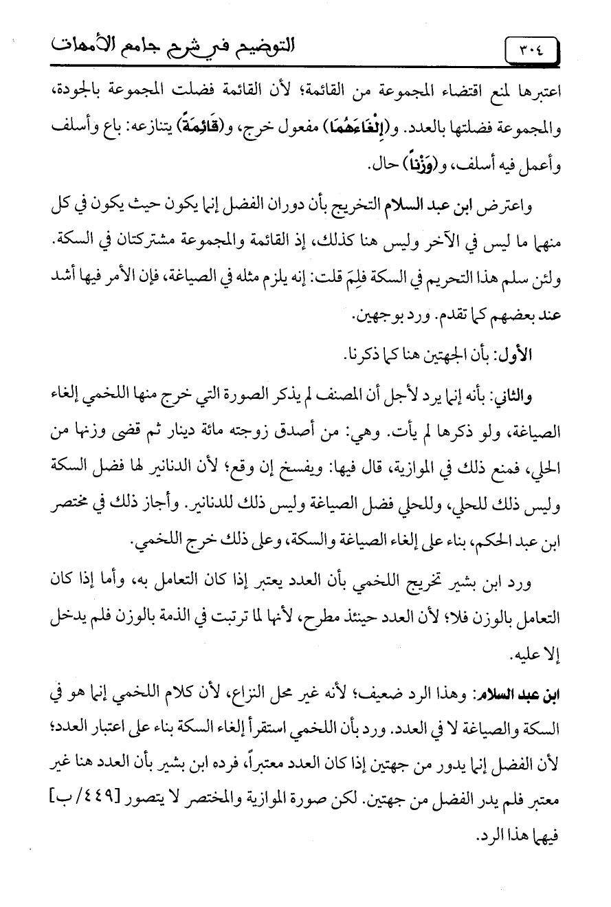 ابن عبد السلام: وهذا الرد ضعيف، لأنه عير محل النزاع، لأن كلام اللخمي إنما هو في السكة والصياغة لا في العدد. ورد بأن اللخمي استقرأ إلغاء السكة بناء على اعتبار العدد، لأن الفضل إنما يدور من جهتين إذا كان العدد معتبراً، فرده ابن بشير بأن العدد هنا غير معتبر فلم يدر الفضل من جهتين. لكن صورة الموازية والمختصر لا يتصور [499/ب] فيهما هذا الرد.