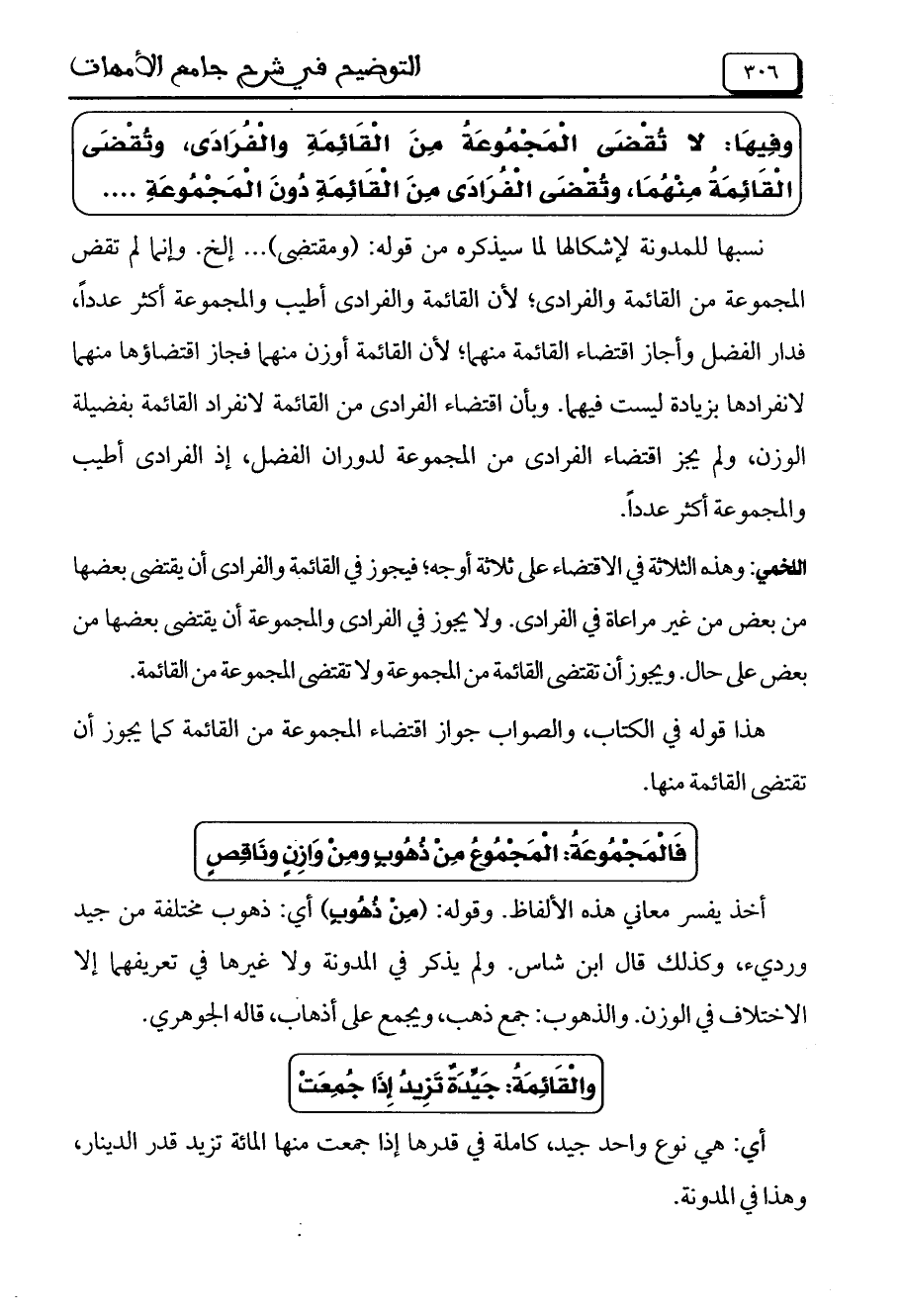 نسبها للمدونة لإشكالها لما سيذكره من قوله: (ومقتضى) .... إلخ. وإنما لم تقض المجموعة من القائمة والفرادى، لأن القائمة والفرادى أطيب والمجموعة أكثر عدداً، فدار الفضل وأجاز اقتضاء القائمة منهما، لأن القائمة أوزن منهما فجاز اقتضاؤها منهما لانفرادها بزيادة فيهما. وبأن اقتضاء الفرادى من القائمة لانفراد القائمة بفضيلة الوزن، ولم يجز اقتضاء الفرادى من المجموعة لدوران الفضل، إذ الفرادى أطيب والمجموعة أكثر عدداً.