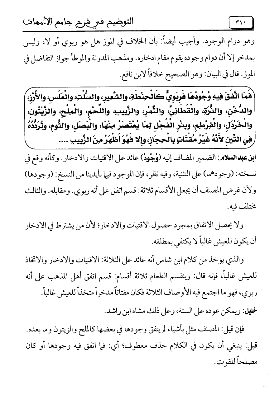 ابن عبد السلام: الضمير المضاف إليه (وجود) عائد على الاقتيات والادخار. وكأ، هـ وقع في نسخته: (وجودهما) على التثنية، وفيه نظر، فإن الموجود فيما بأيدينا من النسخ: (وجودها) ولأن غرض المصنف أن يجعل الأقسام ثلاثة: قسم اتفق على أنه ربوي. ومقابله. والثالث مختلف فيه.