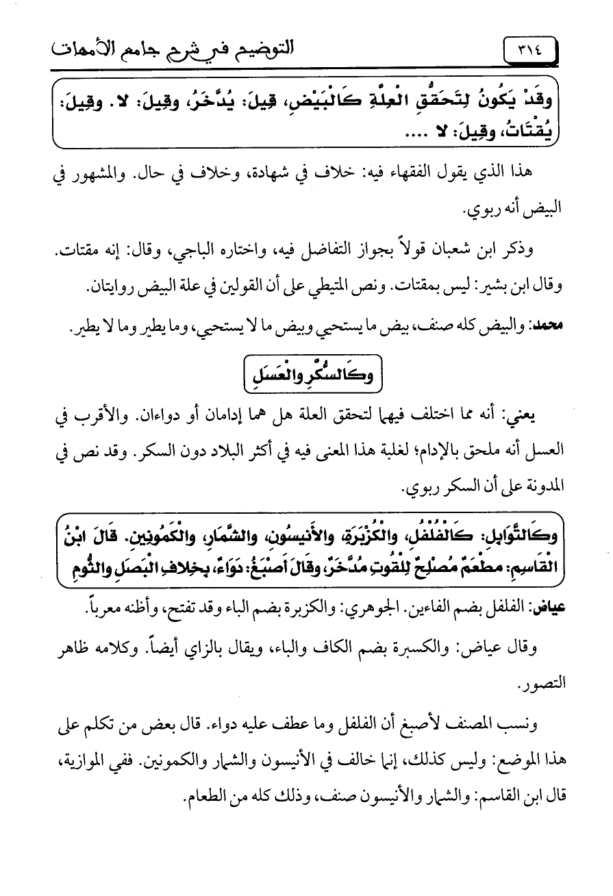 وكالتوابل: كالفلفل، والكزبرة، والأنيسون، والشمار، والكمونين. قال ابن القاسم: مطعم مصلح للقوت مدخر، وقال أصبغ: دواء، بخلاف البصل والثوم