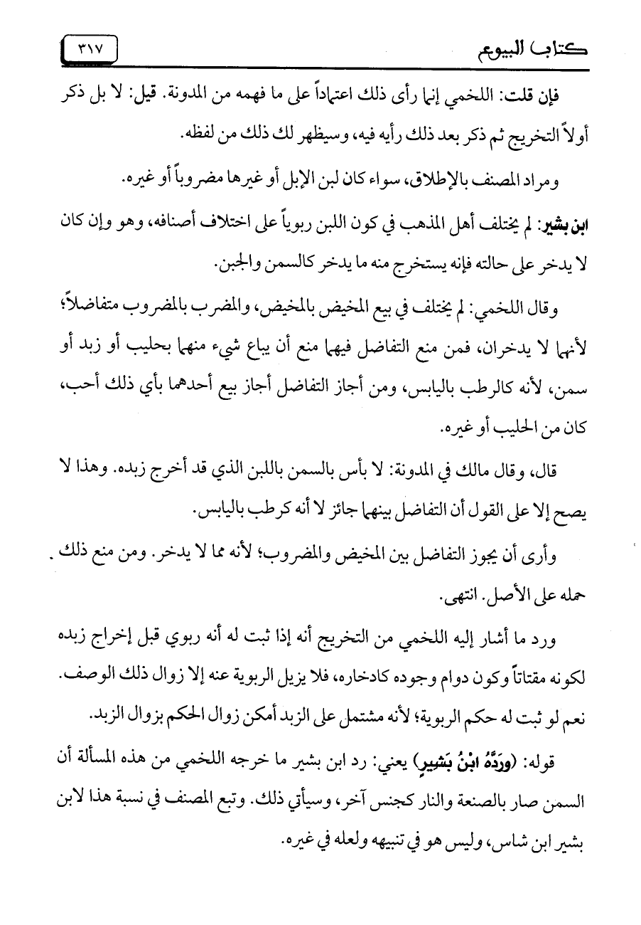 ابن بشير: لم يختلف أهل المذهب في كون اللبن ربوياً على اختلاف أصنافه، وهو وإن كان لا يدخر على حالته فإنه يستخرج منه ما يدخر كالسمن والجبن.