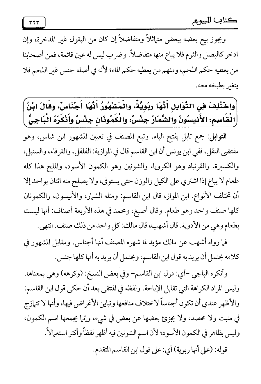 واختلف في التوابل أنها ربوية، والمشهور أنها أجناس، وقال ابن القاسم: الأنيسون والشمار جنس، والكمونان جنس وأنكره الباجي