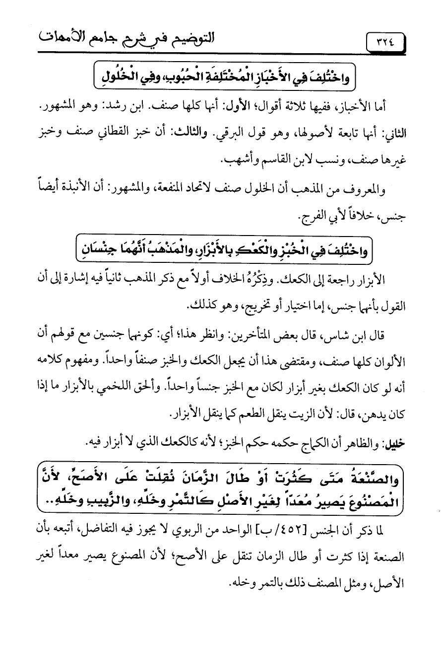 أما الأخبار، ففيها ثلاثة أقوال، الأول: أنها كلها صنف. ابن رشد: وهو المشهور. الثاني: أنها تابعة لأصولها، وهو قول البرقي. والثالث: أن خبز القطاني صنف وخبر غيرها صنف، ونسب لان القاسم وأشهب.