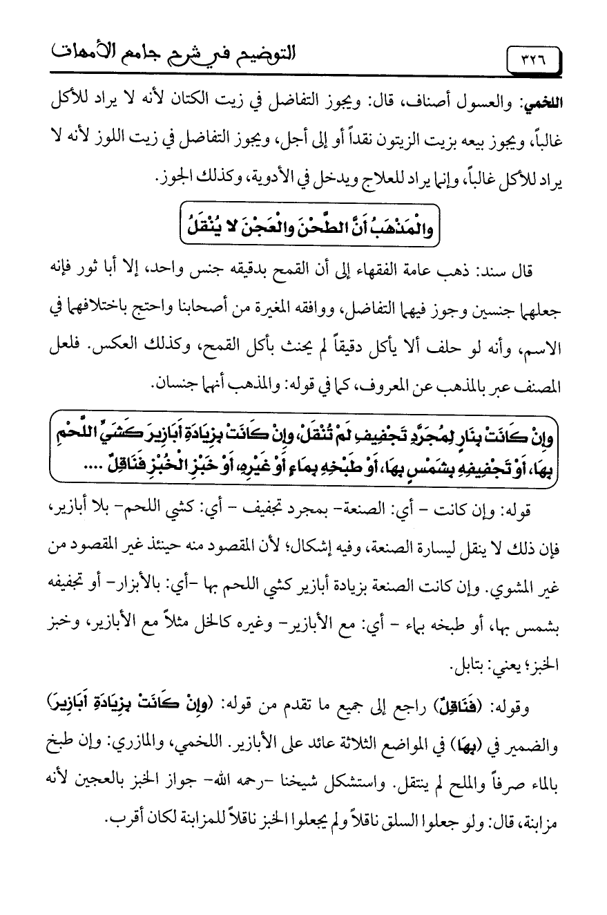 قوله: وإن كانت- أي: الصنعة- بمجرد تجفيف- أي: كشي اللحم- بلا أبازير، فإن ذلك لا ينقل ليسارة الصنعة، وفيه إشكال، لأن المقصود منه حينئذ غير المقصود من غير المشوي. وإن كانت الصنعة بزيادة أبازير كشي اللحم بها- أي: بالأبزار- أو تجفيفه بشمس بها، أو طبخه بماء- أي: مع الأبازير- وغيره كالخل مثلاً مع الأبازير، وخبز الخبز، يعني: بتابل.